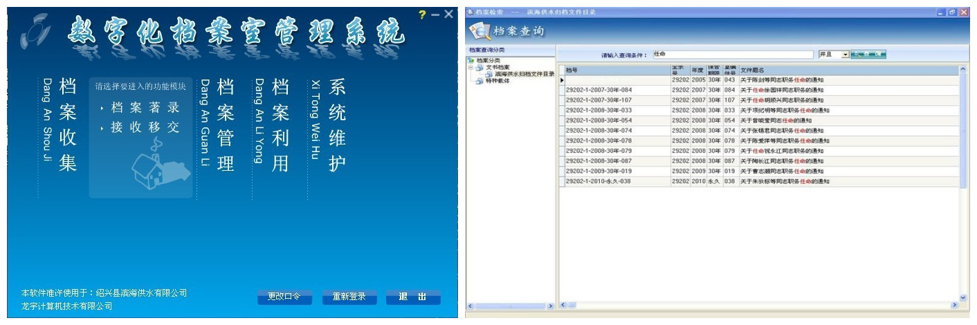 今年年初以來(lái),在縣檔案局指導(dǎo)下,濱海供水公司檔案工作有了較大提高,數(shù)字檔案室建設(shè)基礎(chǔ)良好,軟、硬件條件完善,達(dá)到檔案信息數(shù)字化標(biāo)準(zhǔn)。目前,檔案室建有文書(shū)、會(huì)計(jì)、用戶、工程、人事、設(shè)備、聲像等7大類(lèi)電子檔案數(shù)據(jù)庫(kù)及供水管網(wǎng)信息、綜合水供水信息、小舜江供水信息、綜合水用戶信息、大事記、組織機(jī)構(gòu)沿革等6個(gè)專(zhuān)題數(shù)據(jù)庫(kù),歸檔電子文件達(dá)20995件。同時(shí),開(kāi)通電子檔案信息查詢平臺(tái),并與辦公自動(dòng)化系統(tǒng)實(shí)現(xiàn)聯(lián)通,可隨時(shí)訪問(wèn)利用電子檔案信息,進(jìn)一步提升了供水信息化程度,提高了檔案服務(wù)能力。