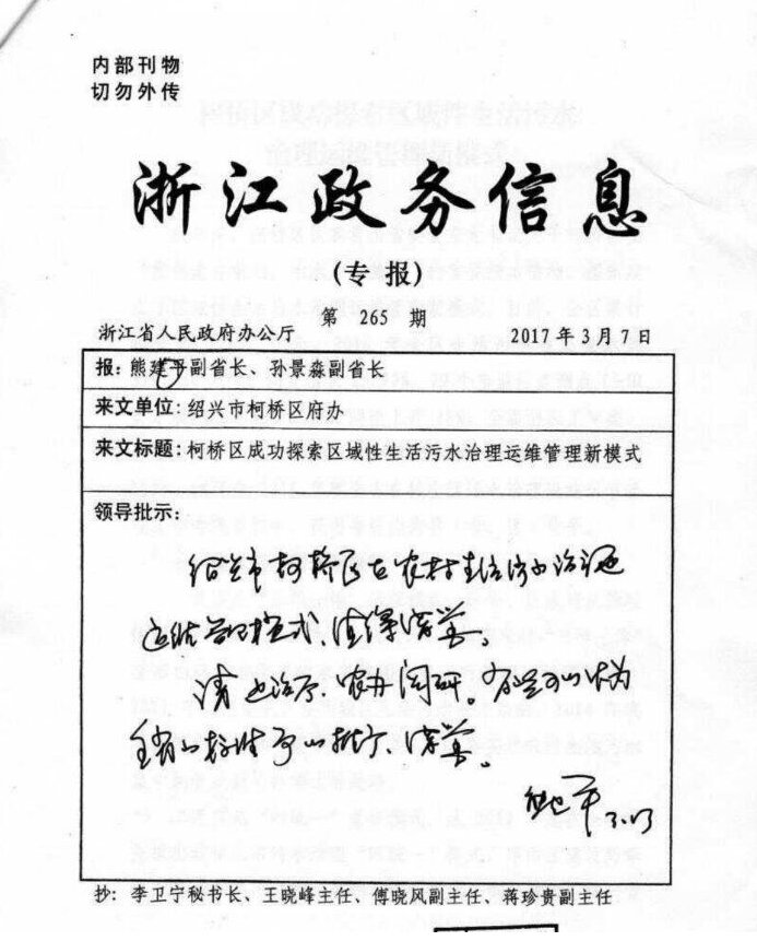 37日,浙江省副省長熊建平對《柯橋區成功探索區域性生活污水治理運維管理新模式》進行批示,認為柯橋區在城鄉生活污水治理運維管理模式值得借鑒,部分經驗可以作為全省的標準予以推廣、借鑒。