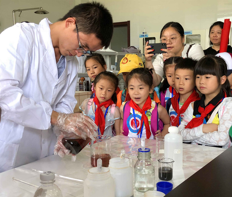 “經(jīng)過三天三夜,混濁的污水就這般變得干凈了。現(xiàn)在,讓我們把這個時間縮短,來一次奇跡的見證。”實(shí)驗(yàn)室里,學(xué)生們圍繞在實(shí)驗(yàn)試劑的瓶瓶罐罐旁,平日里嚴(yán)謹(jǐn)?shù)膶?shí)驗(yàn)技術(shù)人員瞬時變成了神奇的魔術(shù)師。“這就是我們平時未經(jīng)處理的工業(yè)印染污水,只有通過一系列的污水處理環(huán)節(jié),污水才能被排放至河流和大海中。”實(shí)驗(yàn)室技術(shù)人員拿出用作處理污水的專業(yè)試劑,開始帶領(lǐng)學(xué)生做“污水絮凝沉淀”實(shí)驗(yàn)。用膠頭滴管吸取試劑,使用玻璃棒攪拌、靜置,通過一系列的專業(yè)步驟,一杯杯污水慢慢地開始變清。“這就是絮凝沉淀實(shí)驗(yàn),通過加入‘混凝劑’,水中的污染物被不斷凝聚,最終沉淀至燒杯底部,從而使污水變清。”學(xué)生們一邊認(rèn)真聽講一邊情不自禁“哇,水變清
