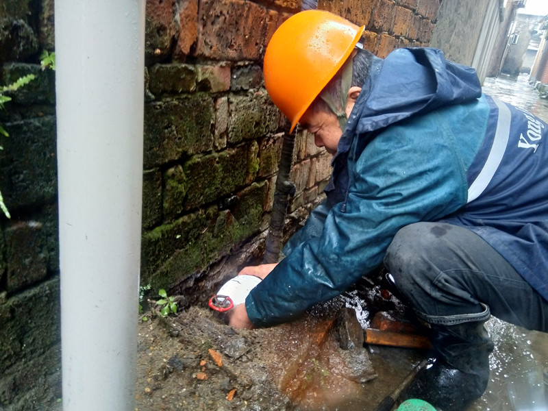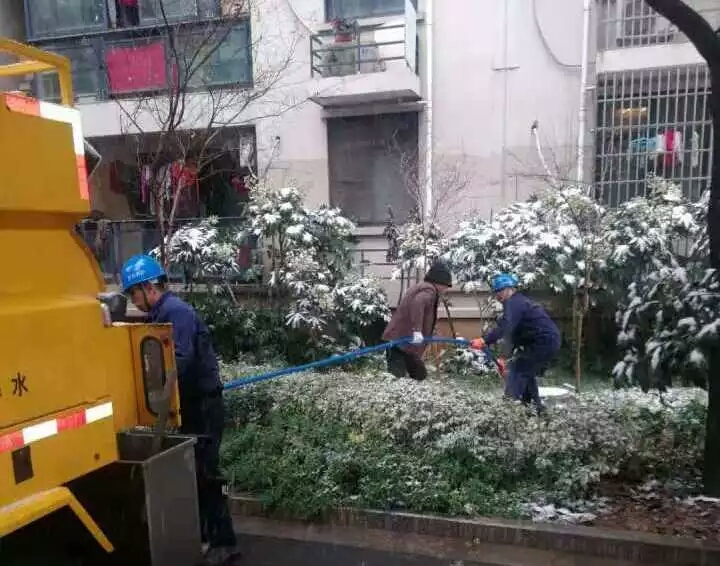 圖為管網養(yǎng)護員冒雪在柯橋街道紅升景園疏通生活污水管道