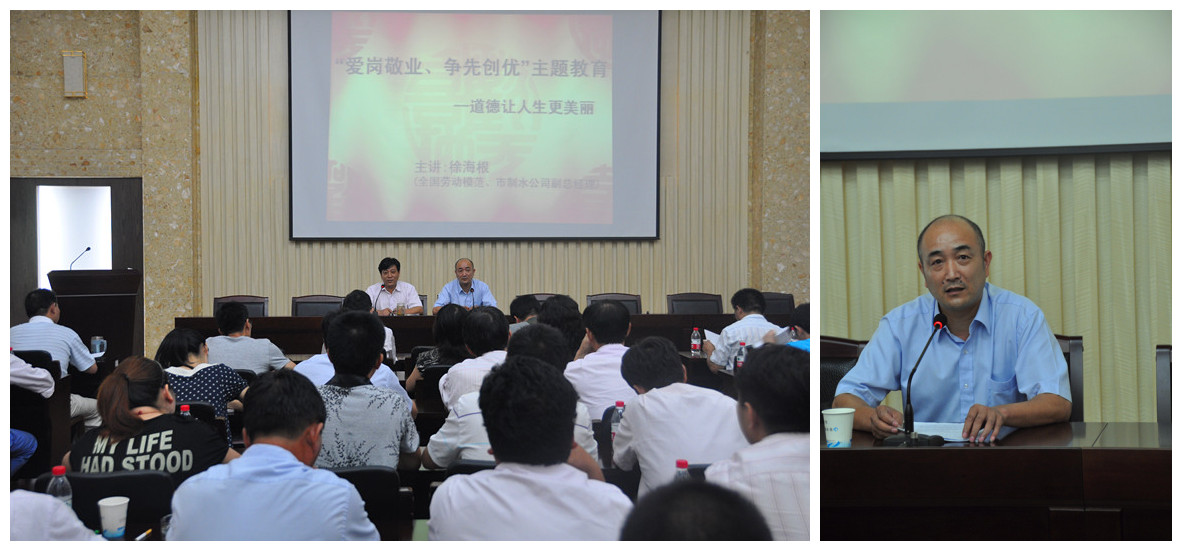 8月11日下午,公司邀請(qǐng)全國勞動(dòng)模范、紹興市制水公司副總經(jīng)理徐海根為公司班組長(zhǎng)以上管理干部作題為《道德讓人生更美麗》的宣講教育,共80余人聆聽了模范的精彩宣講。會(huì)上,徐海根結(jié)合自身工作實(shí)際,用樸實(shí)的語言從職業(yè)道德、責(zé)任心、愛崗敬業(yè)等方面講述親身經(jīng)歷的感人故事,感人至深,催人奮進(jìn)。與會(huì)的每個(gè)人在這里接受了一次心靈的洗禮,取得較好的效果。