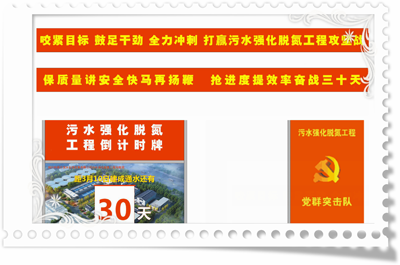 目前,在污水強(qiáng)化脫氮工程現(xiàn)場明顯位置,已樹立工程沖刺倒計(jì)時(shí)牌。公司要求,各級領(lǐng)導(dǎo)干部人員必須清醒認(rèn)識到形勢嚴(yán)峻,要在最后1個(gè)月的時(shí)間里拿出更大的干勁全面沖刺,確保工程建設(shè)任務(wù)的按期完成。同時(shí),公司黨支部錢書記也特別強(qiáng)調(diào),要充分發(fā)揚(yáng)黨員干部先鋒模范帶頭作用,使廣大黨員平常時(shí)候看得出來、關(guān)鍵時(shí)刻站得出來、危急關(guān)頭豁得出去,要將把黨的政治優(yōu)勢轉(zhuǎn)化為項(xiàng)目推進(jìn)優(yōu)勢,把黨建力量凝聚為奮斗合力,確保工程順利建成通水。