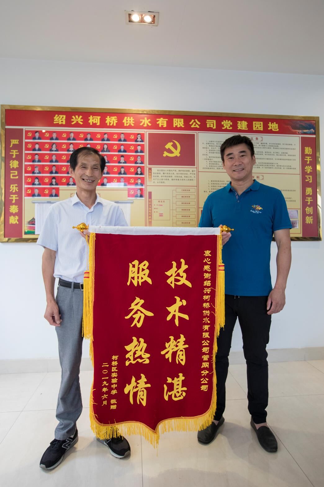 為助力中考,管網分公司立即派出技術精湛的檢漏班組長上門服務。經過一系列檢查,于當晚查出校內供水管道漏點3個,切實解決了柯橋實驗中學的用水問題。熱情服務的態度和精湛的檢漏技術得到了實驗中學的肯定和點贊。為此,6月12日,該??倓湛崎L李強代表柯橋實驗中學向管網分公司送上錦旗,以表感謝。